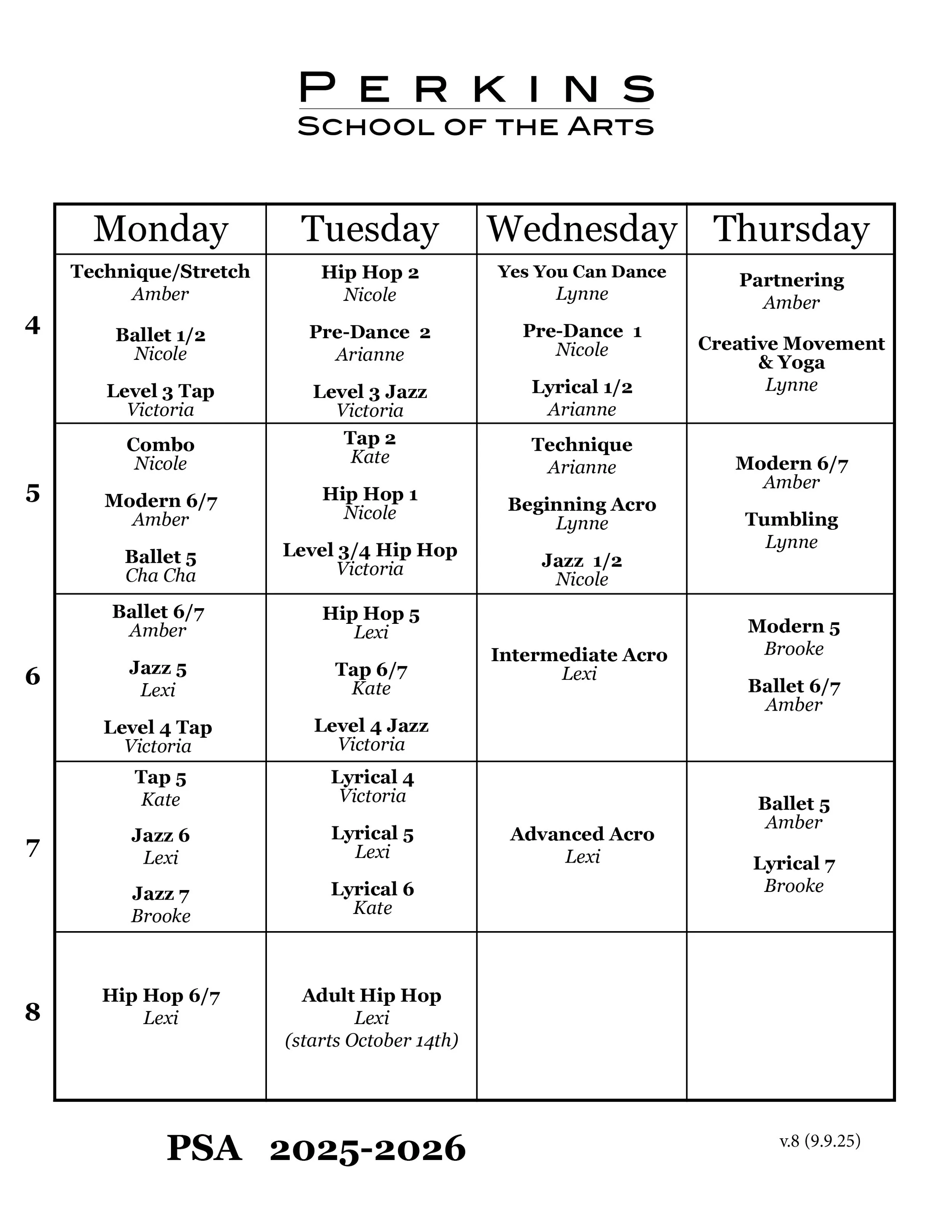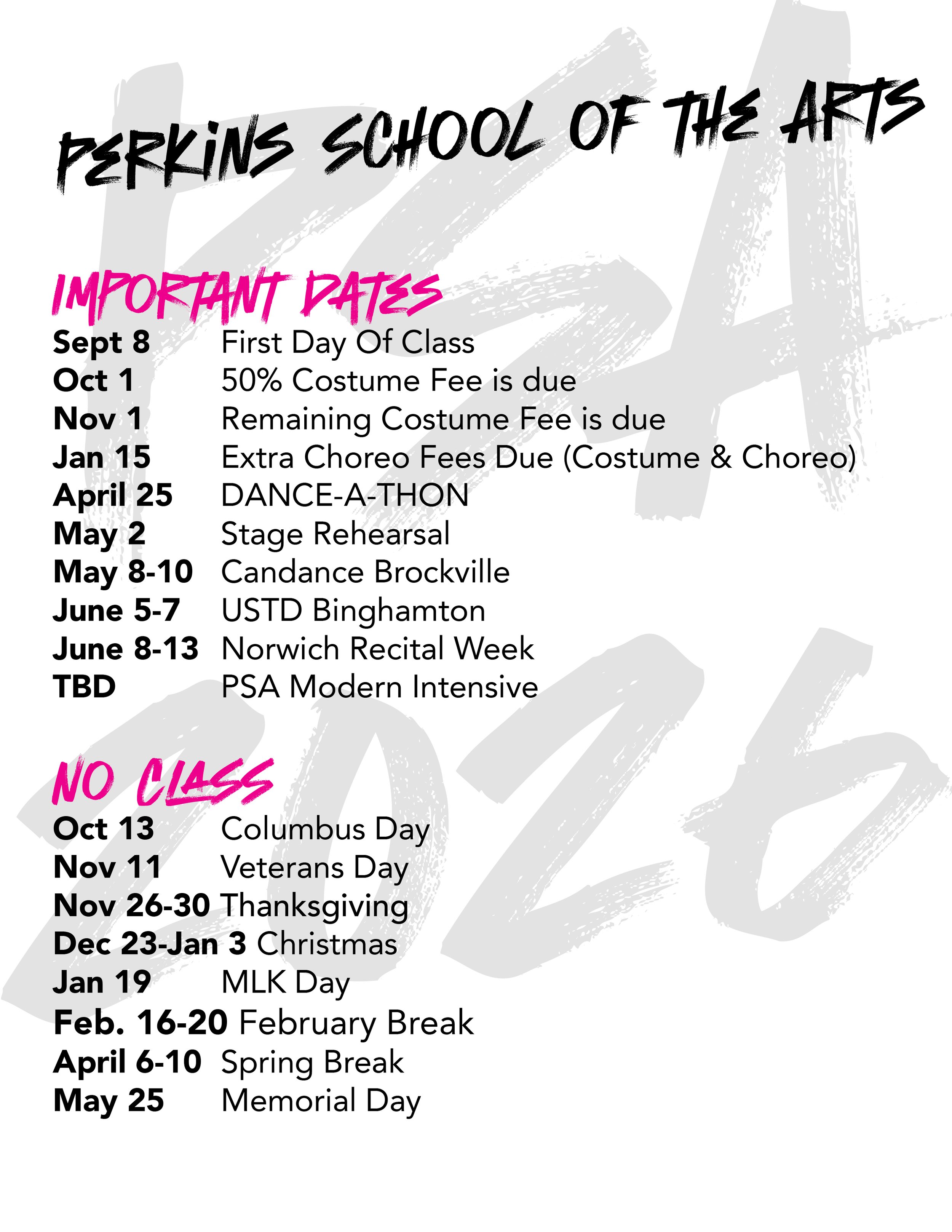 Check out our upcoming classes View fullsize View fullsize Important DatesSept 8 First Day Of ClassOct 1 50% Costume Fee is dueNov 1 Remaining Costume Fee is dueJan 15 Extra Choreo Fees Due (Costume & Choreo)April 25 DANCE-A-THONMay 2 Stage RehearsalMay 8-10 Candance BrockvilleJune 5-7 USTD BinghamtonJune 8-13 Norwich Recital WeekTBD PSA Modern IntensiveNo ClassOct 13 Columbus DayNov 11 Veterans DayNov 26-30 ThanksgivingDec 23-Jan 3 ChristmasJan 19 MLK DayFeb. 16-20 February BreakApril 6-10 Spring BreakMay 25 Memorial DayMay 26 Memorial Day